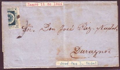October 23rd. 1863, Ciardi # 16 (Michel 17, Scott 16) subtipe 5c, on Complete letter circulated from Montevideo to Buenos Aires. Annotated "Por Vapor" (by steamboat).